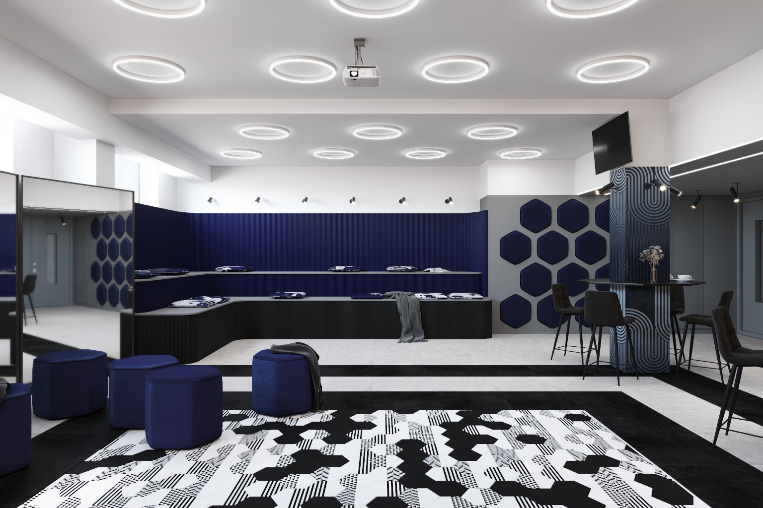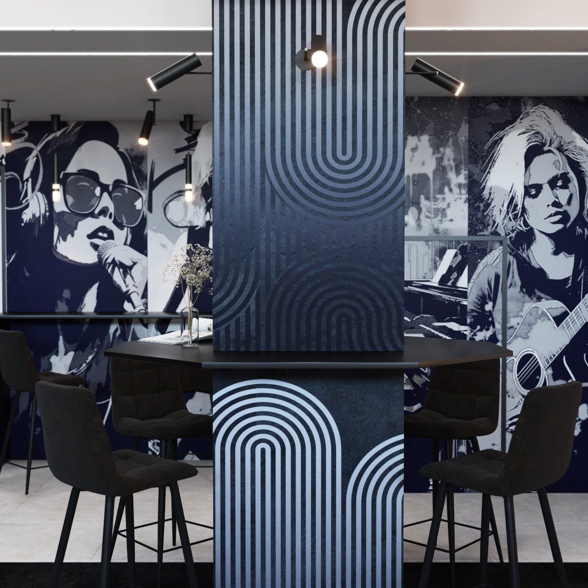 Общественное пространство для проведения мероприятий, также функционал включает караоке зоны и лектории. Основной зал сегментирован по зонам, при этом мы оставили большую часть помещения для массовых мероприятий. В основе визуального ключа лежал уже существующий фирменный стиль, также мы подчеркнули тематику ритмом, графикой, изображением музыкантов и тематической атрибутикой.