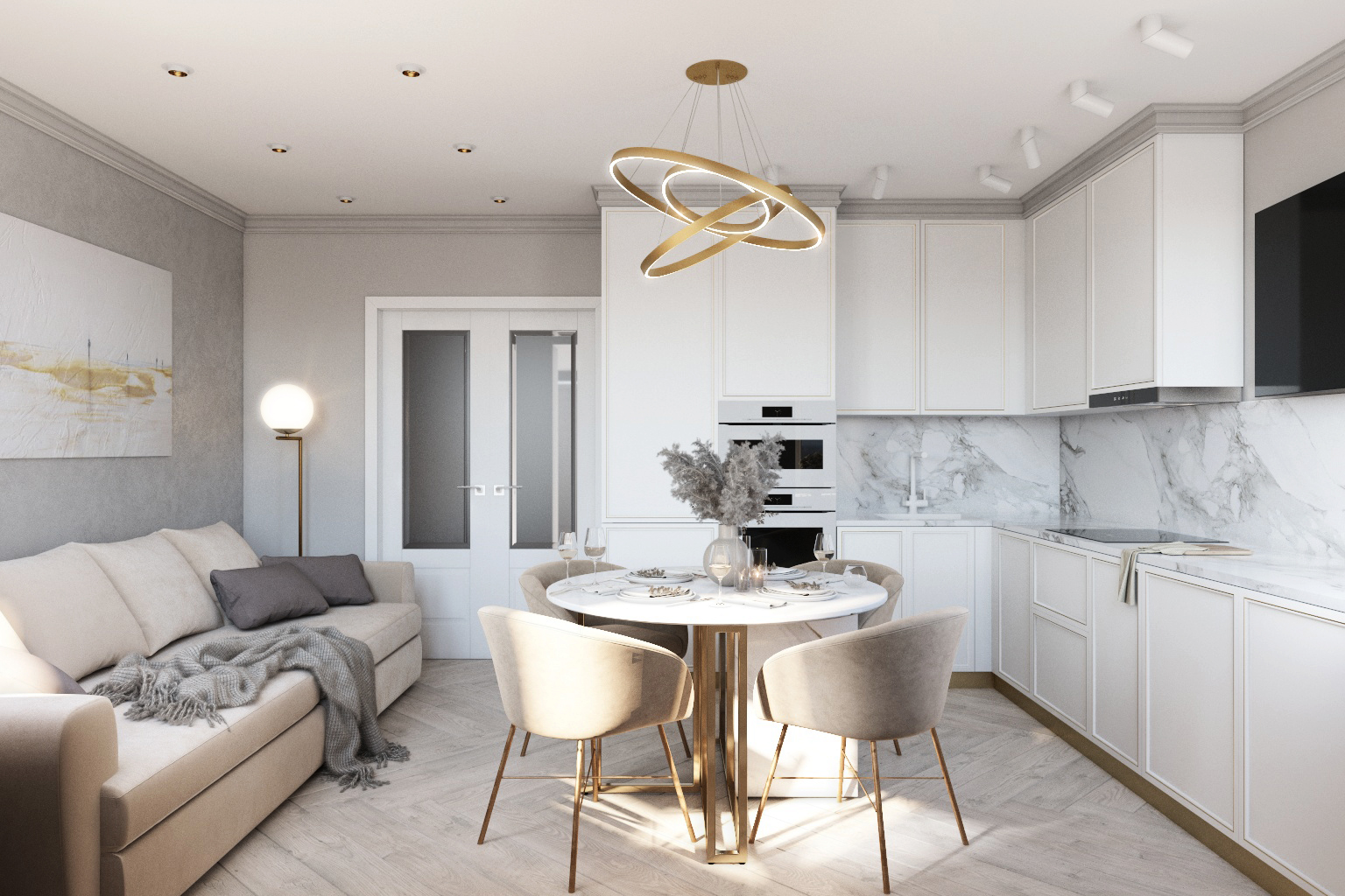 Проект состоит из двух однокомнатных квартир, для заказчиков было важно полностью изолировать зону взрослой дочери и свою. Таким образом мы утвердили общую кухню и гардеробную для двух квартир, а спальные комнаты расположили удаленно друг от друга. Интерьер построен на нюансной цветовой гамме с тональными контрастами: светлый теплый беж и холодный серый.