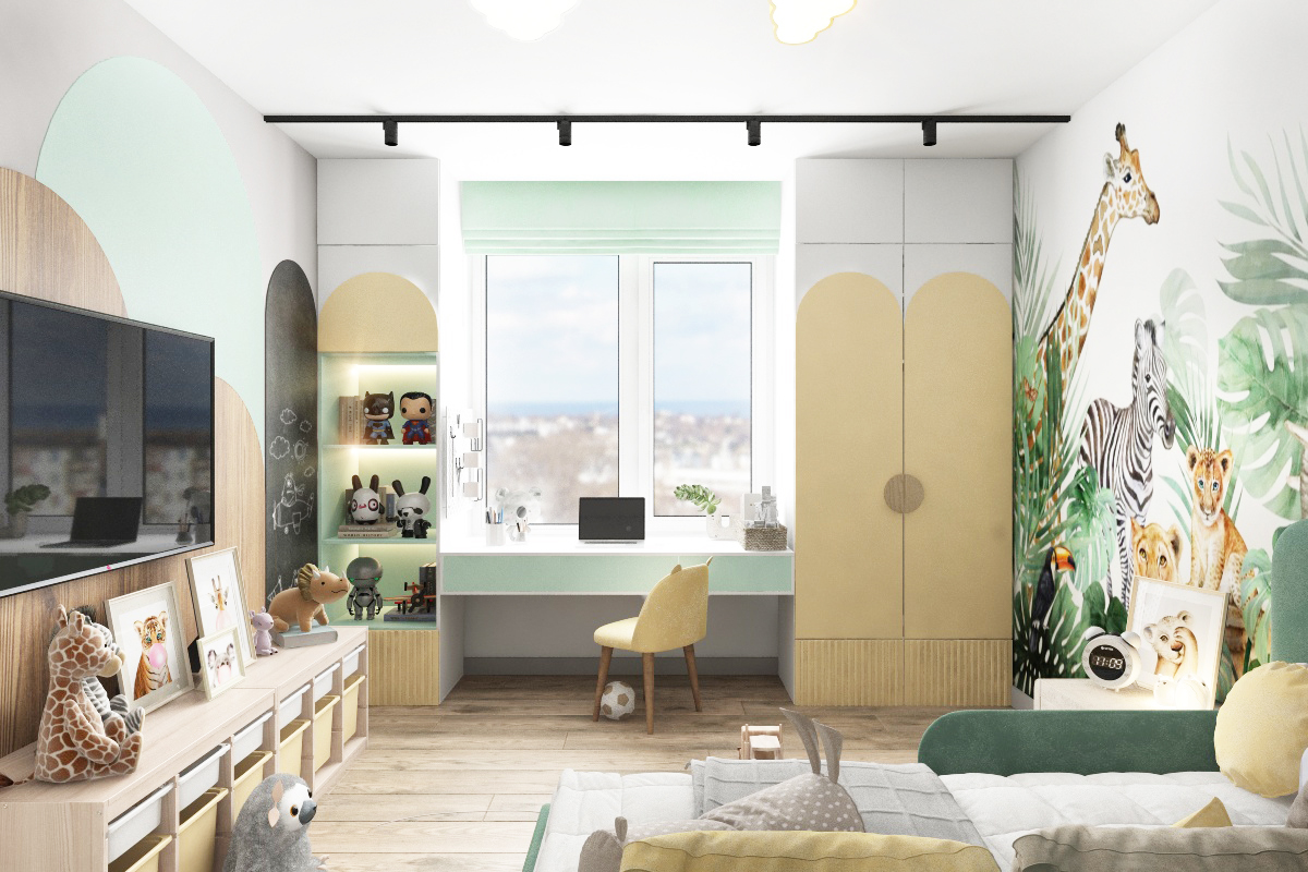 Квартира разработана для молодой семьи с маленьким ребенком. В текущем проекте нам удалось разместить узкую гардеробную в спальне, разделить ее на две зоны: бутовую и для повседневной одежды. Основа помещений - светлые тона с яркими цветовыми вставками.