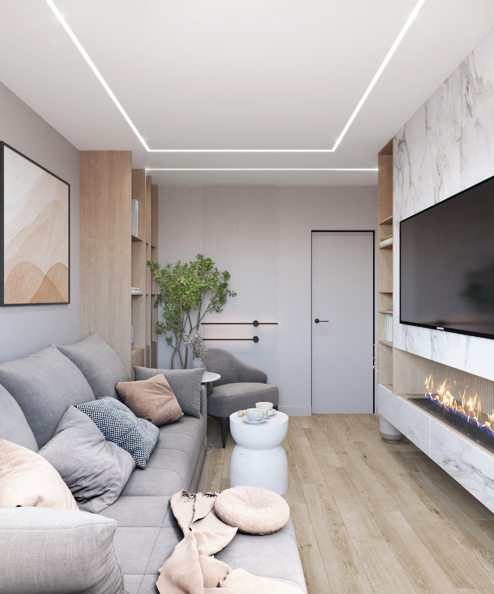 Дизайн проект со сдержанной палитрой, колорит сепии, в основе градация от бежевого к коричневому. Важным запросом для заказчиков были световые линии в потолке, мы сделали их и основным освещением, и дополнительным с возможностью регулировки яркости и теплоты освещения. Также в каждой комнате мы предусмотрели разнообразные зоны хранения: бытовой шкаф и для сезонной одежды в коридоре, шкафы и полки в каждой комнате.