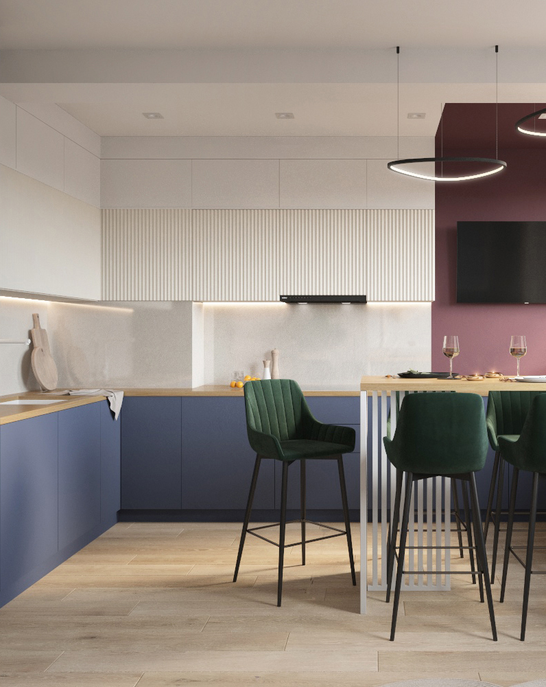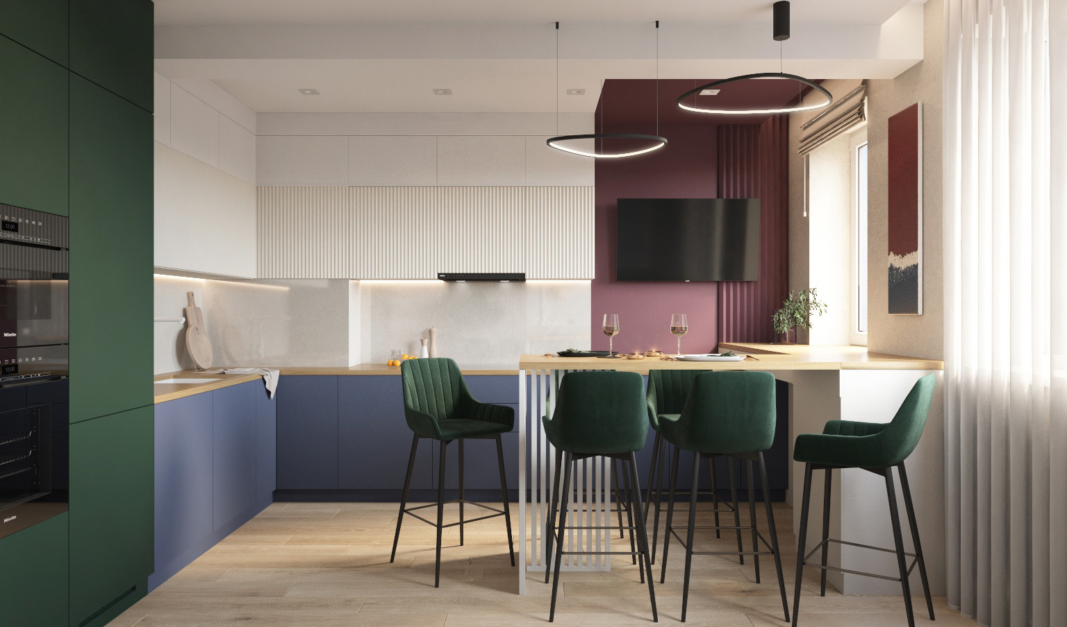Для заказчиков в этом проекте было важно гармонизировать любимые 3 цвета: синий, зеленый и винный, при этом необходимо было сохранить ощущение простора. Для решения этой задачи мы ввели дополнительный песочный цвет, что позволило уравновесить гамму, а также ввели единую тональность и интенсивность акцентных цветов. Проект разработан на основе планировки застройщика, без изменений перегородок. Прачечную зону расположили в закрытом шкафу с перфорацией.