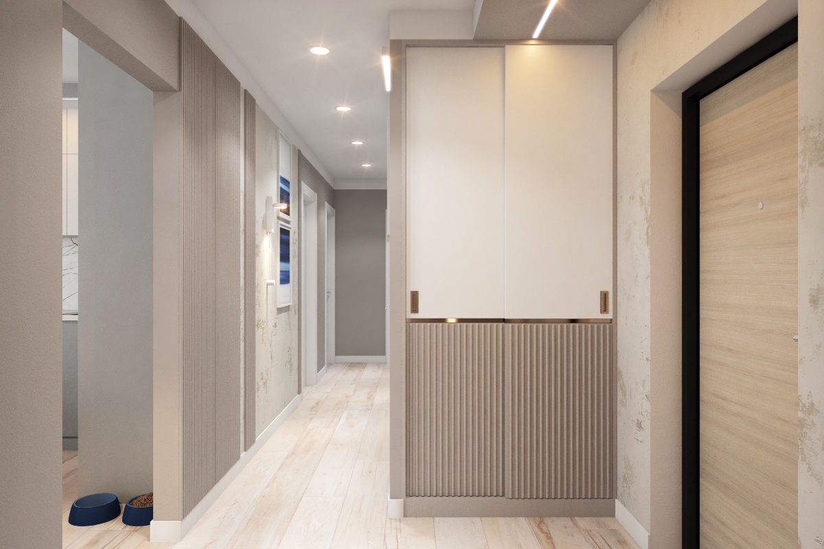 Дизайн-проект для семьи с яркими цветовыми акцентами. В результате перепланировки квартиры от застройщика мы смогли разместить большую гардеробную и многофункциональную кухню-гостиную. Вытянутый балкон из-за невозможности узаконить перепланировку разбили на функциональные и визуальные зоны. Прачечная вынесена в большой бытовой шкаф в коридоре.