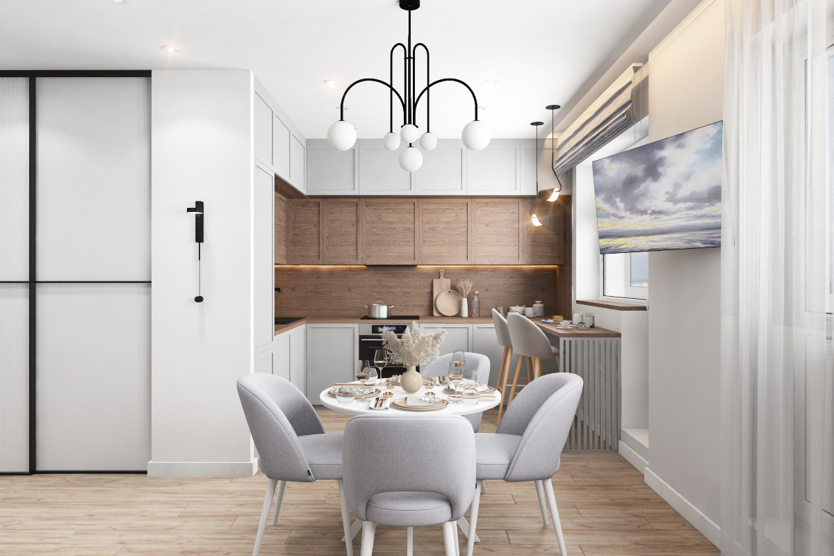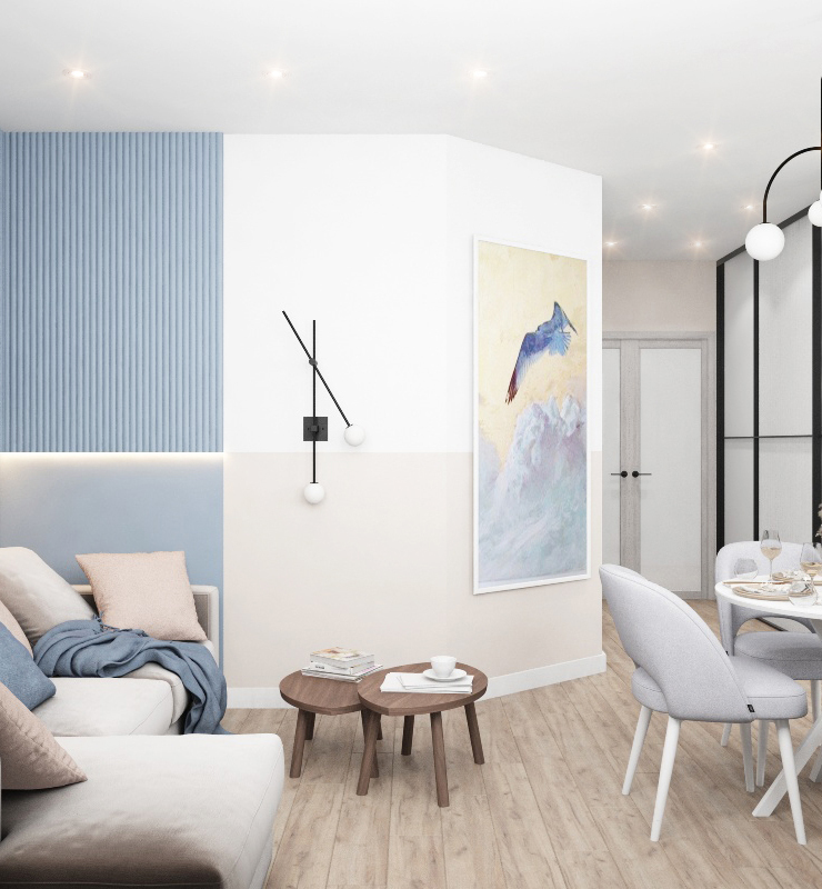 В текущей планировке мы внесли значительные изменения в план застройщика: из гостиной и кухни сделали просторную кухню-гостиную, полноценную спальню с вместительным шкафом, и дополнительную закрытую прачечную зону с хранением. Также объединили санузлы и сделали общую просторную ванную комнату. Цветовая гамма мягкая с контрастным сочетанием бежевых и синих оттенков.
